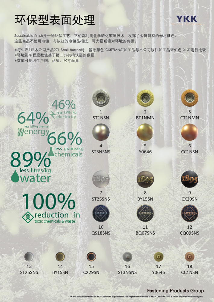 部件表麵加(jiā)工(gōng)是YKK原創的按扣表麵加工技術,該技術利用了材料的基礎色,沒有使用電(diàn)鍍工藝,與以往的電鍍品相(xiàng)比,可(kě)大幅減輕對環(huán)境的負擔(dān)。