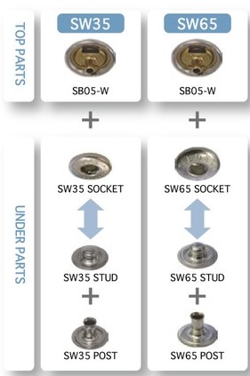 SW-S型彈簧四合扣:可(kě)廣泛適合於不同的產品和麵料上(shàng),如皮革製品(pǐn)等,但不推薦該係列用於針織品,或是延展(zhǎn)性強的布料上。